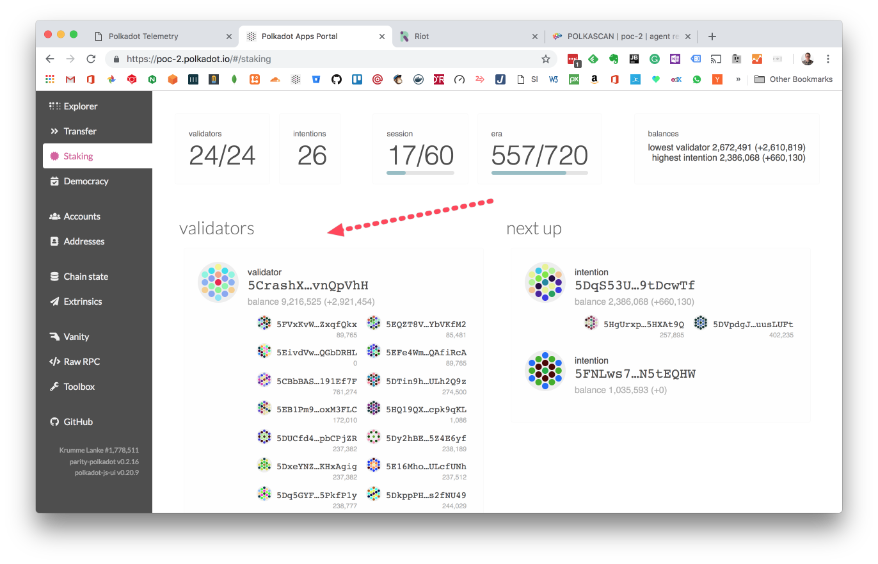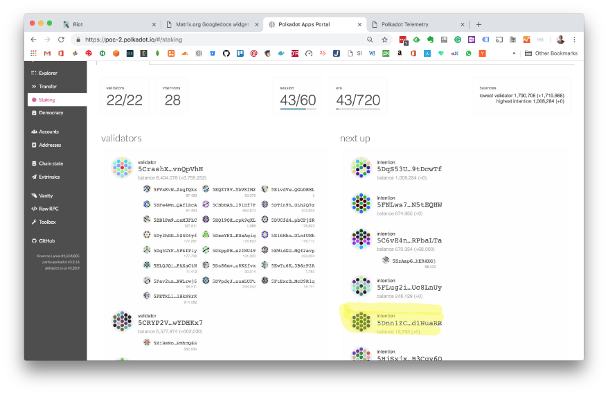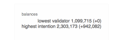 The GUI will also show, the lowest validator node of the era with 1’099’715 DOTS and the highest intention node with 2’303’173 DOTS, which means in the next era, there will be a replacement happening (highest intention node will replace the lowest validator).