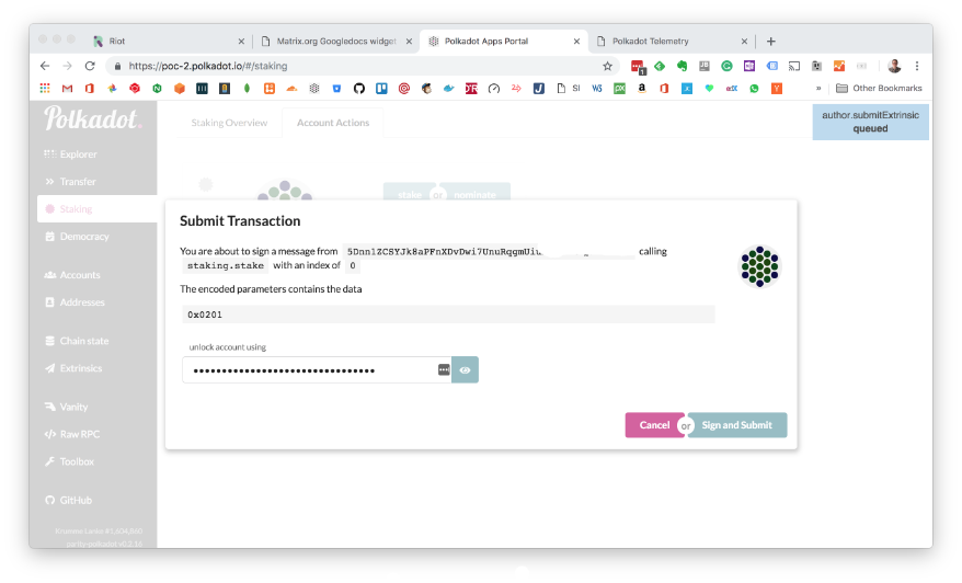 You have to provide your password to sign and submit the “staking.stake” transaction. Due to the fact that is your first stake transaction, it’s index is 0.