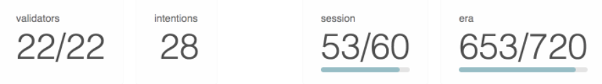 As one can see on the header information, there are 22 slots for Validators available and there are 6 validators (22+6=28) waiting on the intentions list. The time passed in an era is slot 653 of the total of 720.