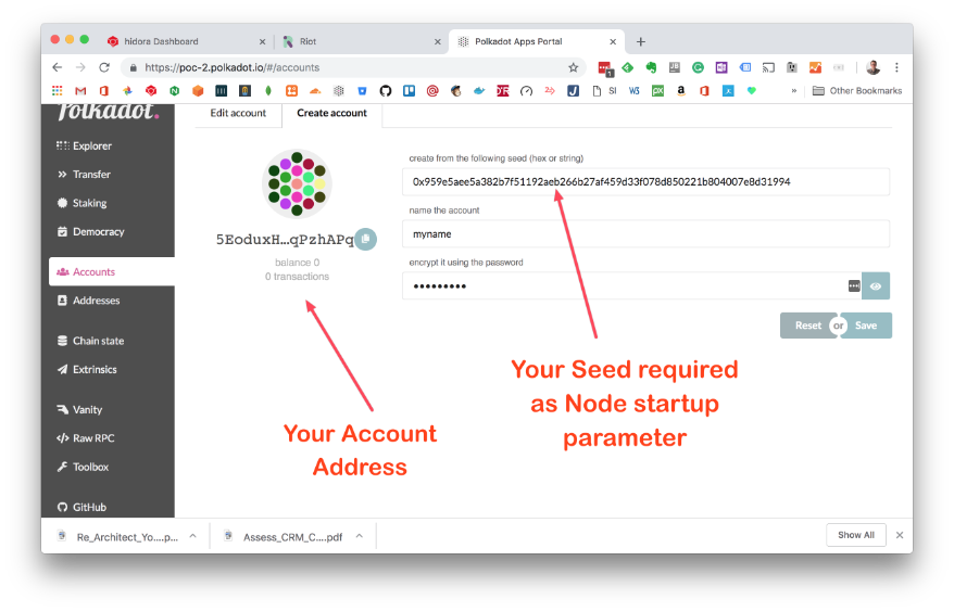 In return, you will get an Account Address (which you can use in public), as well a seed, which you have to keep private! In a later stage when you start up your validator applying as an official validator, you will require your seed again.