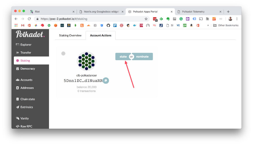 https://poc-2.polkadot.io/#/staking) and press the “stake” action button.